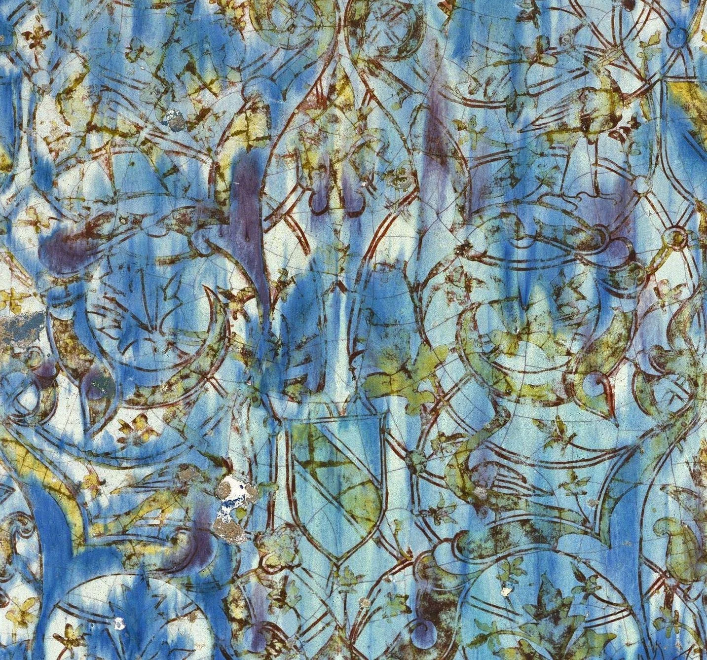 Nasrid tile, fifteenth century, glazed and painted blue and manganese earthenware with lustre, Museo Arqueológico Nacional, Madrid, 1948–31. From Bordoy, Guillermo Rosselló. 1992. “The Ceramics of al-Andalus.” In Al-Andalus: The Art of Islamic Spain, edited by Jerrilynn D. Dodds, 97–103. New York: Metropolitan Museum of Art.